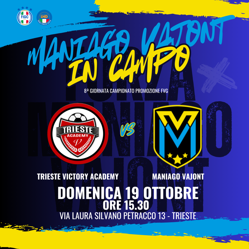 Nuovo appuntamento in campionato in arrivo per l’Asd Calcio Maniago Vajont. Domenica 19 ottobre alle ore 15.30 si giocherà al Comunale di Via Laura Silvano Petracco 13 contro il Trieste Victory Academy, gara valida per l’ottava giornata di Promozione. I nostri ragazzi vogliono riscattarsi dopo la combattuta sconfitta contro il Casarsa.